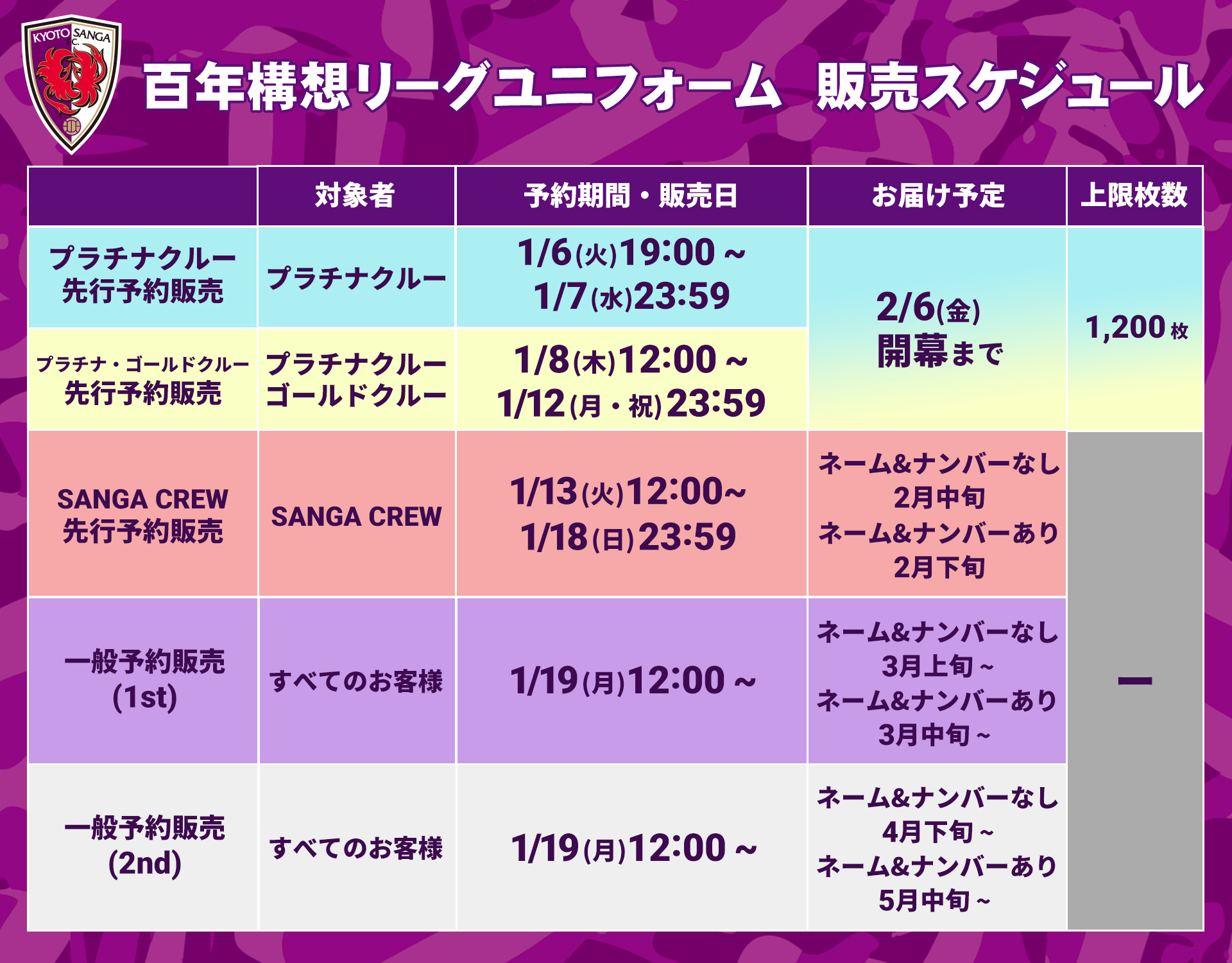 - ※ ユニフォームの生産総数につきましては、2025シーズンと同等の枚数を確保しておりますが、公平な購入機会の確保のため、何卒ご理解とご協力をお願い申し上げます。